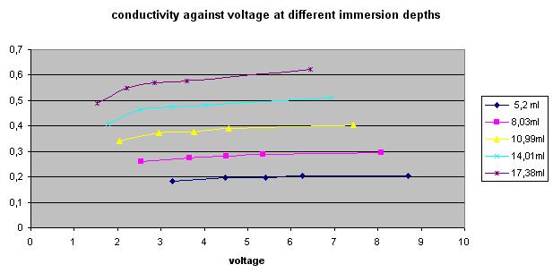 My plots seem to show that conductivity between two nails immersed a few mm in tap water falls off at low voltages instead of being a horizontal flat line as would be the case for a linear ohmic medium. And the deeper the immersion, the less linear the conductivity. Is this normal or an experimental error?
