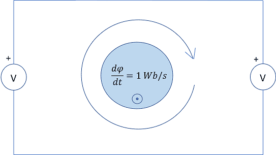 Now, we have a loop containing two voltmeters encircling flux change of 1 Wb/s. Obviously, the induced EMF is 1 Volt and the direction is indicated by the circular arrow. With the way the voltmeters are connected, the one on the right would show a positive voltage, the other negative voltage, just like in the video.