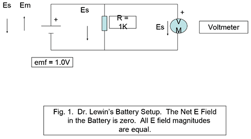 For example, in his battery setup (Fig. 1) Dr. Lewin assumes a net battery E field opposite to the direction of the E field in the resistor. In fact the battery contains two canceling field contributions: E_s points + to − and E_m points − to +. The line integral of E_m over the battery (- to +) is the battery emf. A voltmeter senses only the line integral of E_s; otherwise a DC voltmeter directly across a battery would read 0 V. In the resistor E_s points + to −; the circulation of E_s around the loop is zero as required by Kirchhoff’s voltage law. The circulation of E_m, and thus of the net E, equals ##iR## (with ##i## the current and ##R## the resistor).*