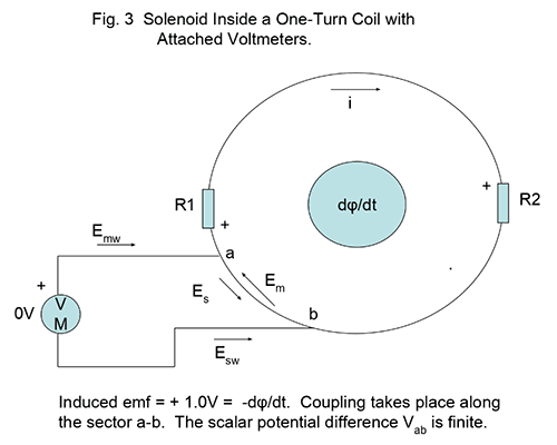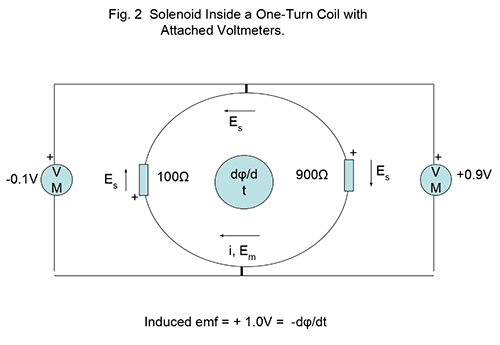 Now to address the main topic — the solenoid, the single-turn loop, and voltmeters positioned as shown in Fig. 2 — assume again that the loop wires have negligible resistance.