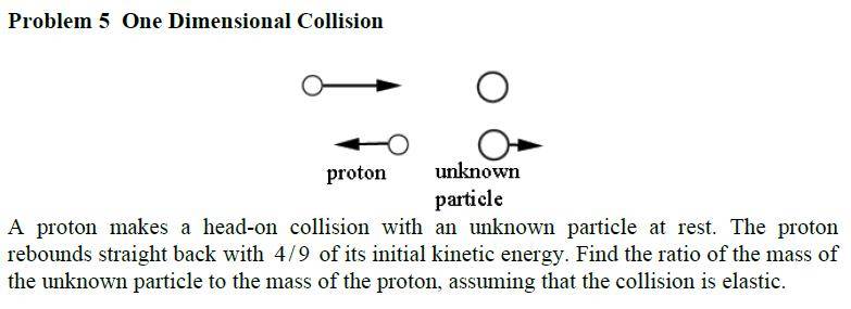 Let the mass of the proton be m and the mass of the unknown particle km with k>1. Since the unknown particle is initially at rest, its post-collision momentum will be the same as the collision impulse so we can easily calculate an expression for its kinetic energy and compare with 5/9 the kinetic energy of the proton.