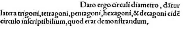 Therefore the diameter of the circle being given, the sides of the triangle, tetragon, pentagon, hexagon and decagon, which may be inscribed in the same circle, have been given – as was to be shown.