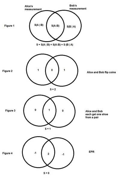 This is the essentially quantum situation. Alice and Bob each measure the spin of one of a pair of correlated particles along some axis. If Alice ignores Bob, then again her measurement seems like a coin flip: she gets one of two possible results, with equal probability. Similarly for Bob. So again [itex]S(A) = S(B) = 1[/itex]. But in this case, the total information is 0! There is only one possibility for a pair of entangled particles, so the composite information [itex]S[/itex] is zero. (Which is what the Von Neumann entropy gives for the composite two-particle state). But these two facts, plus the definitions of mutual information and conditional information lead us to absolutely weird conclusions: