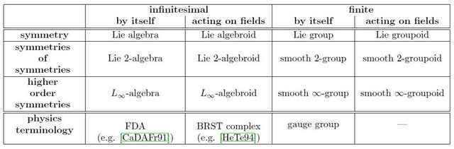 Of particular interest in physics are smooth gauge transformations that arise by integration of infinitesimal gauge transformations. An infinitesimal smooth groupoid is a Lie algebroid and an infinitesimal smooth ##\infty##-groupoid is an infinity-Lie algebroid. The importance of infinitesimal symmetry transformations in physics, together with the simple fact that they are easier to handle than finite transformations, makes them appear more prominently in the physics literature. In particular, the physics literature is secretly well familiar with smooth ##\infty##-groupoids in their infinitesimal incarnation as ##\infty##-Lie algebroids: these are equivalently what in physics are called BRST complexes. What are called ghosts in the BRST complex are the cotangents to the space of equivalences between objects, and what are called higher order ghosts-of-ghosts are cotangents to spaces of higher order equivalences-of-equivalences. We indicate in a moment how to see this.