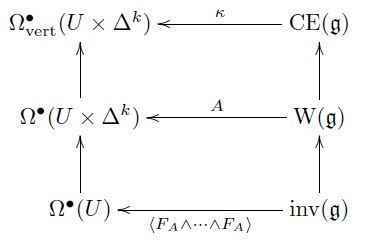 Cartan had introduced all these dg-algebras as algebraic models of the universal ##G##-principal bundle. We had seen above that homomorphisms ##\Omega^\bullet_{\mathrm{vert}}(U \times \Delta^k) \longleftarrow \mathrm{CE}(\mathfrak{g})## constitute the gauge symmetry group ##G## as integration of the paths of infinitesimal symmetries. Here the vertical forms on ##U \times \Delta^k## are themselves part of the sequence of differential forms on the trivial ##k##-simplex bundle over the given coordinate chart ##U##. Hence consider compatible dg-algebra homomorphisms between these two sequences: