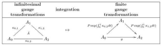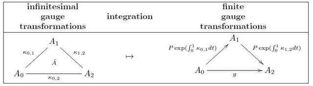 of a 1-form ##A_U## along ##U## and 1-form ##A_{\Delta^k}## along ##\Delta^k##. The second summand ##A_{\Delta^k}## is the vertical component of ##A##. The commutativity of the top square above says that as a vertical differential form, ##A_{\Delta^k}## has to be flat. By the previous discussion this means that ##A_{\Delta^k}## encodes a ##k##-tuple of ##G##-gauge transformations. Now we will see how these gauge transformations naturally act on the gauge field ##A_U##: