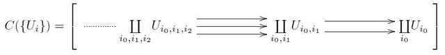 Another basic example of a smooth simplicial presheaf is the nerve of an open cover. Let ##\Sigma## be a smooth manifold and let ##\{U_i \longrightarrow \Sigma\}_{i \in I}## be a cover of ##\Sigma## by coordinate charts ##U_i \simeq \mathbb{R}^n##. Write ##U_{i_0 \cdots i_k} := U_{i_0} \underset{X}{\times} U_{i_1} \underset{X}{\times} \cdots \underset{X}{\times} U_{i_k}## for the intersection of ##(k+1)## coordinate charts in ##X##. These arrange into a simplicial object like so: