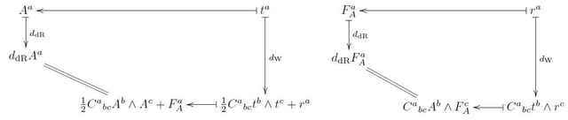 Notice here that once ##t^a \mapsto A^a## is chosen, then the diagram on the left uniquely specifies that ##r^a \mapsto F_A^a## and then the diagram on the right is already implied: its commutativity is the Bianchi idenity ##d F_A = [A\wedge F_A]## that is satisfied by curvature forms.