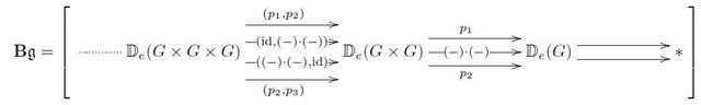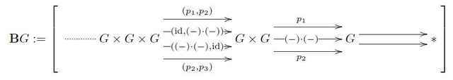 of sets of ##k##-simplices for all ##k##, together with compatible maps between these that restrict ##k+1##-simplices to their ##k##-faces (the face maps) and those that regard ##k##-simplices as degenerate ##k+1##-simplices (the degeneracy maps). From the above picture, the face maps of ##\mathbf{B}G## in low degree look as follows (where ##p_i## denotes projection onto the ##i##th factor in a Cartesian product):