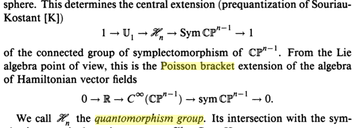 This means that under Lie integration the Poisson bracket turns into a central extension of the group of Hamiltonian symplectomorphisms of ##(X,\omega)##. And either it is the fairly trivial non-compact extension by ##\mathbb{R}##, or it is the interesting central extension by the circle group ##U(1)##. For this non-trivial Lie integration to existing, ##(X,\omega)## needs to satisfy a quantization condition which says that it admits a prequantum line bundle. If so, then this ##U(1)##-central extension of the group ##Ham(X,\omega)## of Hamiltonian symplectomorphisms exists and is called… the quantomorphism group ##QuantMorph(X,\omega)##: