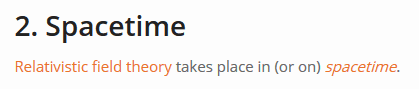A minor note: Urs, I imagine you being more of a geometer than an analyst, so I would say: Relativistic field theory takes place on spacetime.Okay, I changed it. But I wasn't meaning to be speaking with any mathematical perspective at this point, but instead to first say something intuitive. I suppose we all feel that we live "in" spacetime, not "on" it. No?