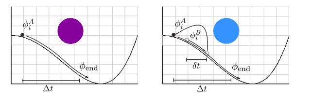 Suppose it rolls down to ##\phi_{\rm end}## in time ##\Delta t##. Another region, ##B##, starts inflating at the same time as region ##A## but at a slightly lower energy density: after the field rolls down classically for a time, ##\delta t##, there is a quantum jump up to ##\phi^A_{i}##. This nucleates a fluctuation region that begins to inflate from ##\phi^A_{i}##, and so, like region ##A##, rolls down to ##\phi_{\rm end}## in time ##\Delta t##. Both region A and the fluctuation within region ##B## are the same size since they both inflated for a time ##\Delta t##, however, region ##A## ended inflation a time ##\delta t## sooner, and, hence, has a different density.