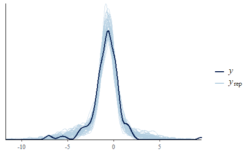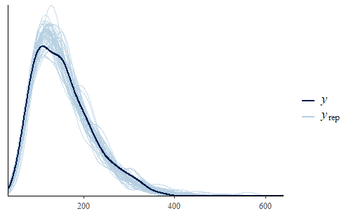 w <- dat$weight wrep <- posterior_predict(post,draws = 500) ppc_dens_overlay(w, wrep[1:50,])