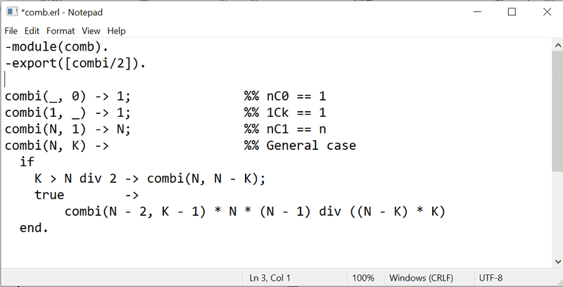 Rosettacode has a different approach to binomial coeffecients using an explicit accumulator to make the tail recursion more obvious: [URL]https://rosettacode.org/wiki/Evaluate_binomial_coefficients#Erlang[/URL]