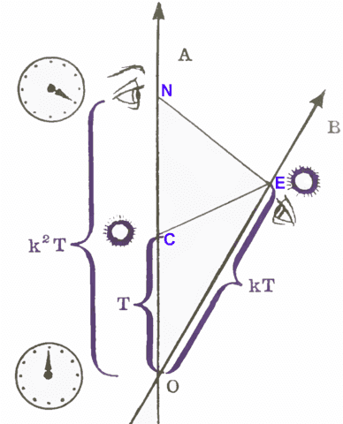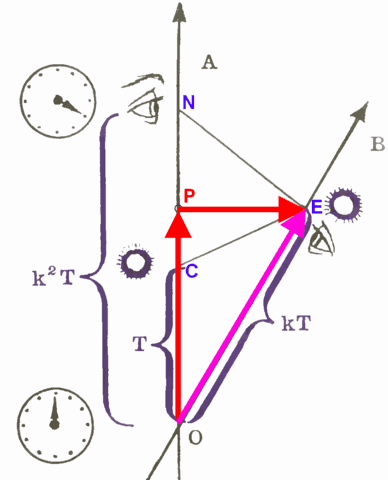 $$k^2 =\frac{\Delta u}{\Delta v}=\frac{\Delta t+\frac{\Delta x}{c}}{\Delta t-\frac{\Delta x}{c}}=\frac{1+\frac{\Delta x}{c\Delta t}}{1-\frac{\Delta x}{c\Delta t}}=\frac{1+(V/c)}{1-(V/c)},$$we recognize that the ##k##-factor is the Doppler factor $$k=\sqrt{\frac{1+(V/c)}{1-(V/c)}}.$$ - By multiplication, we obtain an interesting expression of the square-magnitude of ##\vec {OE}## [on Bob’s worldline] in terms of a Pythagorean-like combination involving ##k## and Alice’s ##\Delta t## and ##(\Delta x/c)## and her ##T## (which we have made explicit):