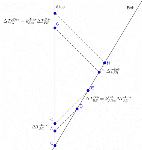 $${\Delta u}{\Delta v}=\left(\Delta t^{\cal Alice}_{OE}\right)^2-\left(\frac{\Delta x^{\cal Alice}_{OE}}{c}\right)^2=(k_{Alice,Bob} T^{\cal Alice})^2,$$