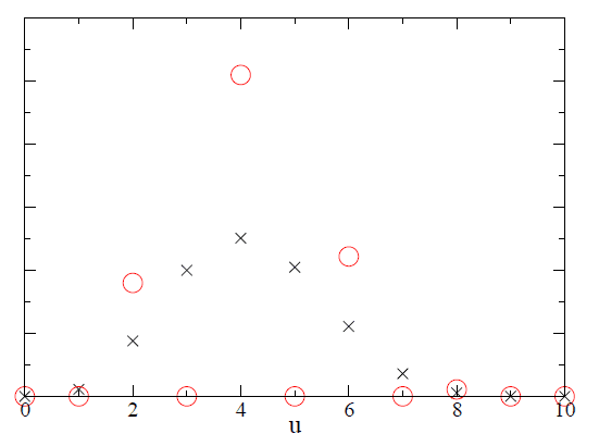 But suppose we adopt a different prior. Say that we have some knowledge that suggests that there must be an even number of black balls in the urn. Maybe we have done some early experiments that support this assumption, or maybe we have some insight into the process by which the urns are filled. Either way, it’s possible to examine the same hypothesis, [itex]u[/itex], under a different set of prior assumptions—under a new model, [itex]\mathcal{M}_2[/itex]. Now [itex]p(u|\mathcal{M}_2) = 1/5[/itex] for [itex]u[/itex] even, and [itex]p(u|\mathcal{M}_2) = 0[/itex] for [itex]u[/itex] odd. The Bayesian evidence is the sum Eq. (\ref{ev}) but now only over even [itex]u[/itex], giving [itex]0.00054[/itex]. When we plot [itex]p(u|O,\mathcal{M}_2)[/itex], we find that the posterior odds are larger (for [itex]u[/itex] even) than the odds under the original prior, Figure 2,