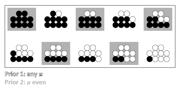 Fig 3. Graphical depiction of the configuration space of the urn problem: prior 1 includes all configurations, prior 2 includes only those with an even number of black balls.