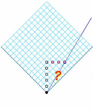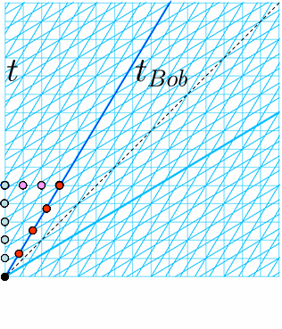 Note that there are three inertial reference frames displayed here: Alice, outbound-Bob, and inbound-Bob. This is not easily constructed on the two-observer graph paper or on the hyperbolic graph paper, especially if Bob’s inbound speed is different from Bob’s outbound speed. (Note that the subdivided grid which displayed a glimpse of the unit hyperbola displayed clock diamonds for nine inertial reference frames.)