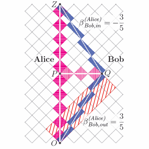 (Side comment: We have highlighted a parallelogram in the grid with diagonal OQ, which we refer to as the “causal diamond” of OQ. The area of that causal diamond is equal to the square of the time interval from O to Q. This suggests another, more powerful method to construct Bob’s clock diamonds if we know that OQ is along Bob’s worldline. Refer to the paper for details.)