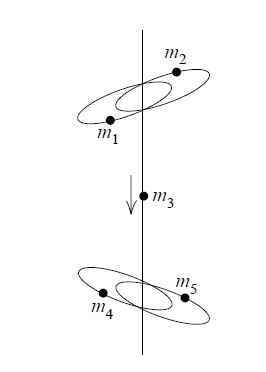 This sounds crazy at first, but it works like this: a pair of heavy particles orbit each other, another pair of heavy particles orbit each other, and these pairs toss a lighter particle back and forth. Xia and Saari’s nice expository article has a picture of the setup.