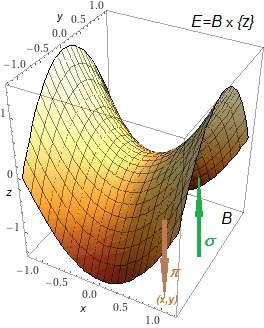 The graph of the function ##f:B\longrightarrow \{z\}## is ##\{(x,y,x^2-y^2)\}=B \times \{z\}=E\cong \mathbb{R}^3.## ##B## is called the base space, here the ##(x,y)##-plane, and ##E## the total space, here the entire ##\mathbb{R}^3.## We have a natural projection ##\pi:E\longrightarrow B\, , \,(x,y,z)\mapsto (x,y).## Any smooth function ##\sigma :B\longrightarrow E## such that ##\pi(\sigma (x,y))=(x,y)## is called a section, and the set of all sections is denoted by ##\Gamma(E).## But what does this have to do with differentiation and the saddle? We already introduced the (tangent) vector field, which is also called tangent bundle or just vector bundle.