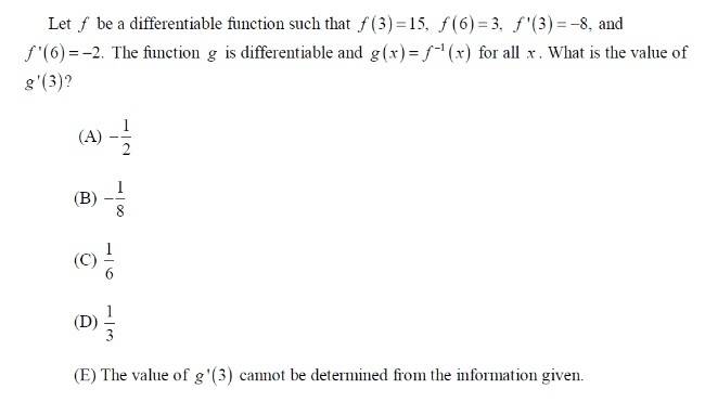 - A later reply mentions that \( f(6) = 3 \) and provides a calculation for \( g'(3) \) based on the derivative \( f'(6) = -2 \), leading to \( g'(3) = -1/2 \).