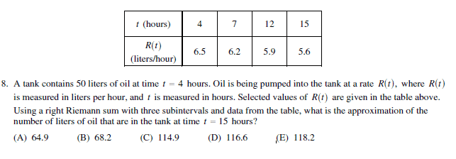 The discussion revolves around the application of Riemann sums in the context of an AP Calculus exam problem. Participants explore how to calculate the total area under a curve represented by a function R(t) over a specified interval, considering the nuances of interval lengths and heights.
