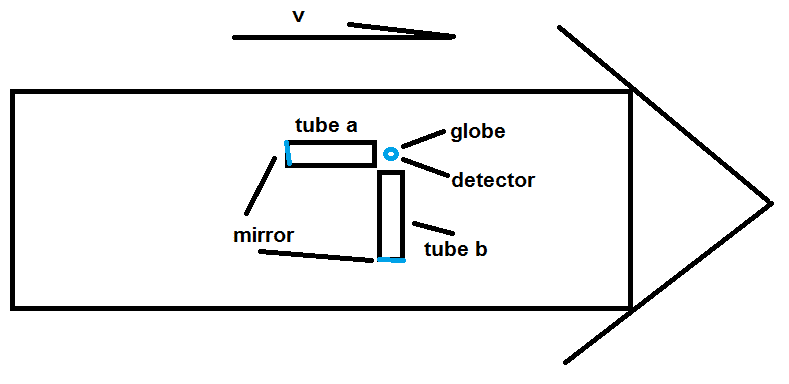 The detector detects if 2 flashes of light arrive at the detector at the same time. The bulb flashed for a brief instant and the detector detects if the flash arrives from each tube at the same time.
