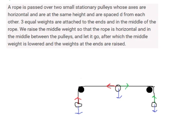 Is tension force in rope same all the time , does acceleration of middle weight change during time and why would middle weight go up (rise)?