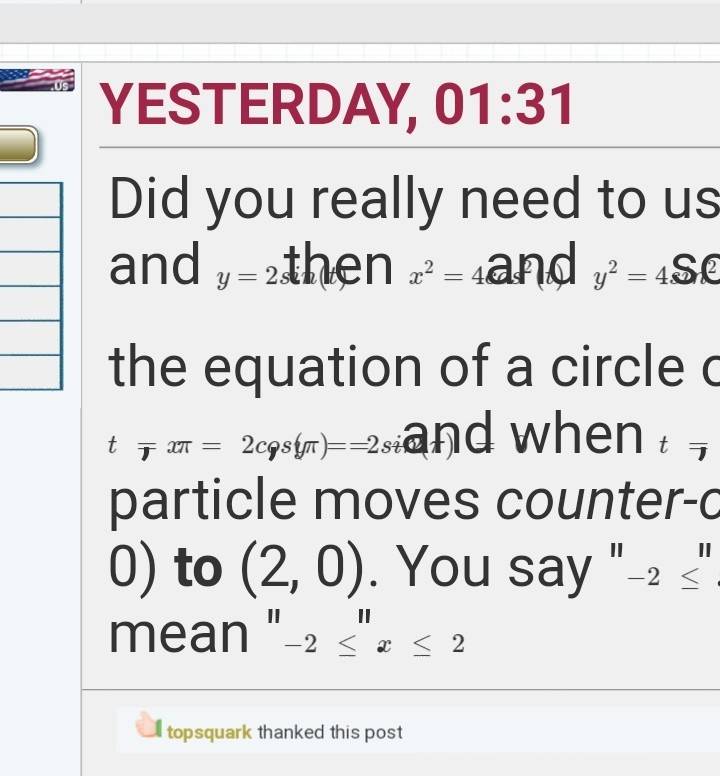 11.1 Parametric equations and a parameter interval for the motion of a particle in the xy-plane given. Identify the paritcals path by finding a Cartestian equation for it $x=2\cos t, \quad 2 \sin t, \quad \pi\le t \le 2\pi$