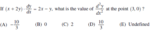 - Another participant provides the expression for the second derivative, $$\dfrac{d^2y}{dx^2} = \dfrac{(x+2y) \left(2 - \frac{dy}{dx} \right) - (2x-y)\left(1+2\frac{dy}{dx}\right)}{(x+2y)^2}$$, noting a specific value for $$\dfrac{dy}{dx}$$ at the point (3,0).