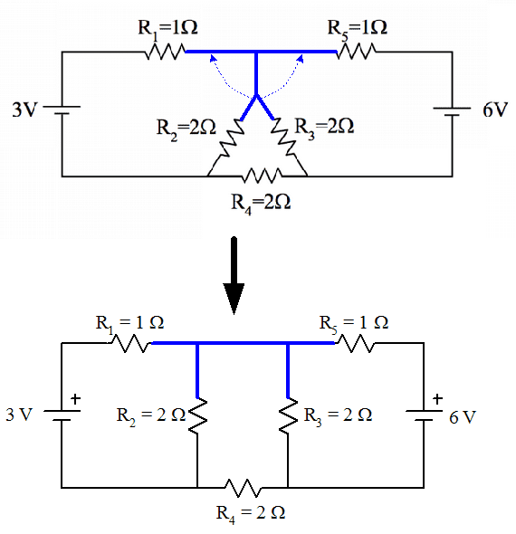 So I presume that what I'll be looking at here is the use of Kirchhoff's Rules and Ohm's Law. I do not know how to approach this as I have never come across a problem involving a triangular loop. Are the resistors in series in this loop? They must be, but what does that give me? Can I collapse all three of them into one resistor? Would that benefit me? Also, I've split I1 at the top of the middle wire, giving me I3 going down and splitting up again around the triangle, giving me I5 going down through R2, and a new current I4 going through R3, as well as I2 going through R5 and continuing throughout the right loop. Is this correct?