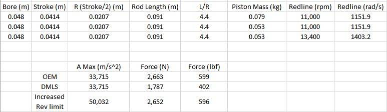 By my calculations, at maximum piston acceleration (~TDC) @ 11,000 RPM, the inertia forces on the piston are about 33% less.