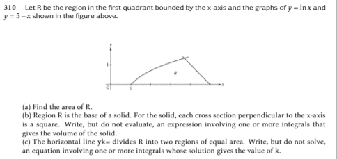The discussion revolves around solving a problem from an AP Calculus exam related to finding the area between two functions, specifically the natural logarithm function and a linear function. Participants explore methods to find the intersection points and evaluate integrals to determine the area under the curves.