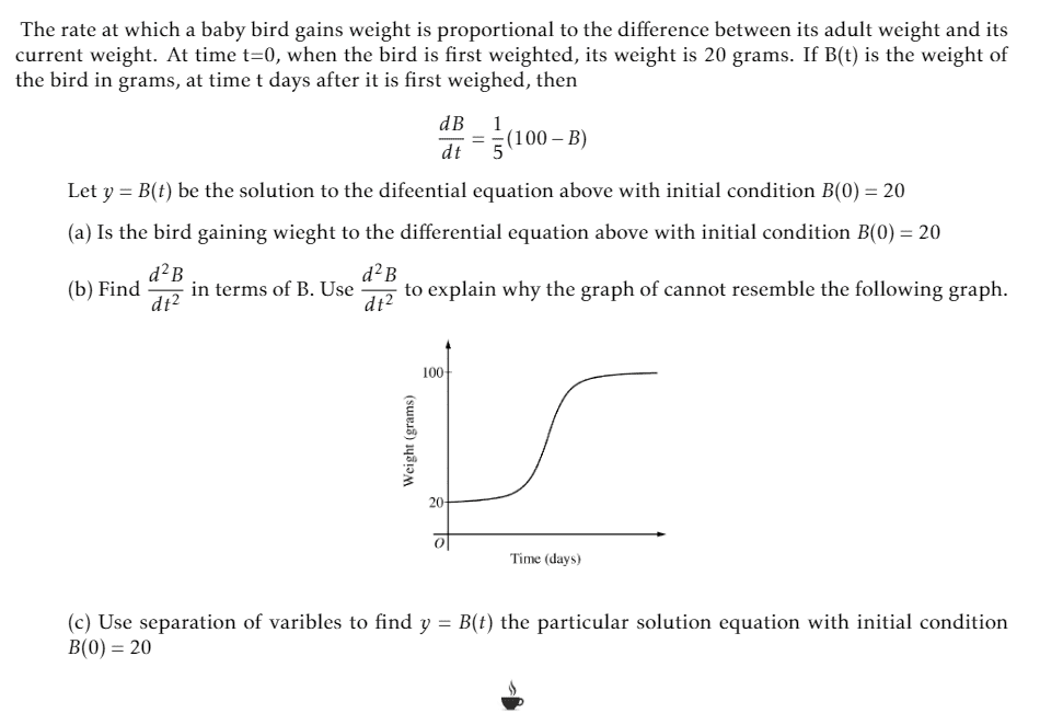 The discussion revolves around a differential equation related to bird weight, specifically analyzing the growth dynamics of the bird's weight over time. Participants explore the mathematical modeling of weight gain, including the implications of the derived equations and the behavior of the function representing weight.