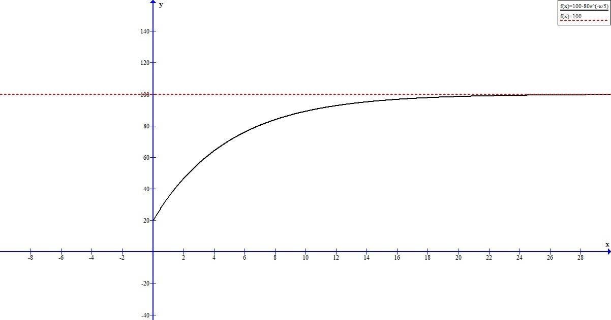 - Participants derive the function $B(t) = 100 - 80e^{-t/5}$, describing it as an example of inhibited exponential growth, with a limit of $100$ as $t$ approaches infinity.