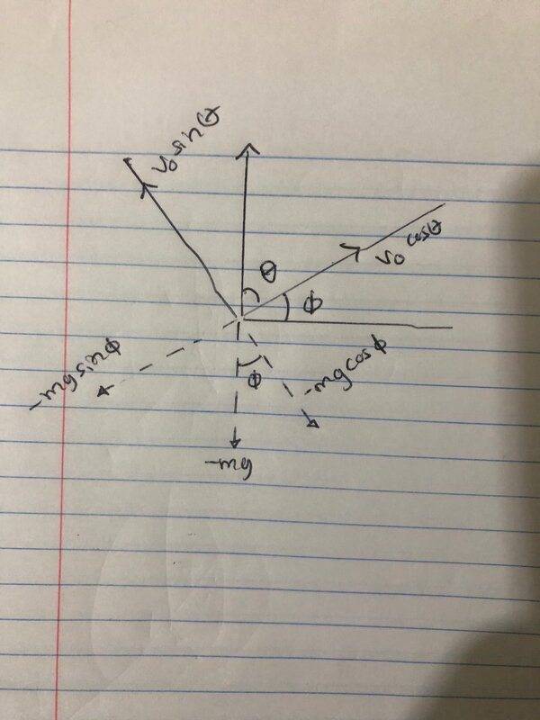 I understand how the diagram below determined the ##x## and ##y## axis for the velocity vectors but I don't understand the gravity vectors. What I don't understand about the gravity vectors is why is ##-mg## in the ##y-##axis equal to ##-mg\cos\theta## and the ##x-##axis is equal to ##-mg\cos\theta## even though the diagram for the velocity vector has the ##y-##axis as ##v_0\sin\theta## which is exactly on the same axis for the gravity vector so shouldn't the gravity vectors ##\cos## and ##\sin## be flipped? Also, I don't understand how the ##\phi## angle below the horizontal was determined in the diagram. Shouldn't that ##\phi## be instead ##\theta##?