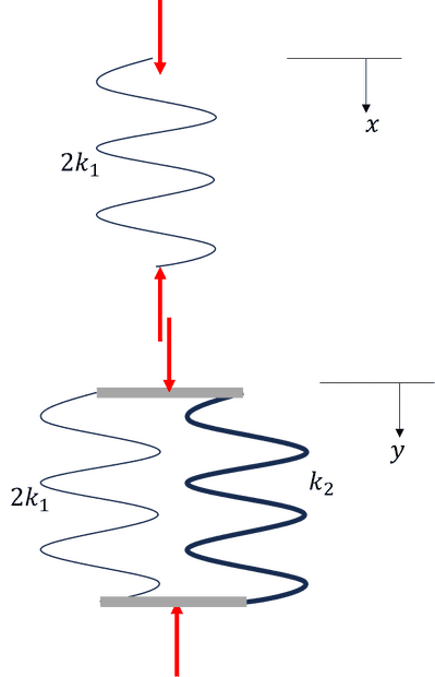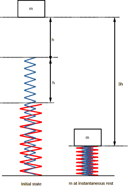 palaphys said:Homework Statement: A block dropped onto a spring system as shown in the figure. If the spring constant of the longer spring is mg/2h then find the spring constant of the larger.