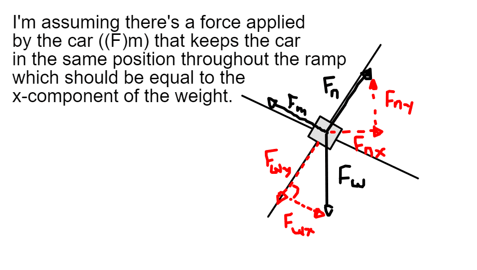 Here is where I'm unsure of what to do. Will the frictional force of the car point directly to the center of the circular motion or will it point down towards the direction of the ramp?