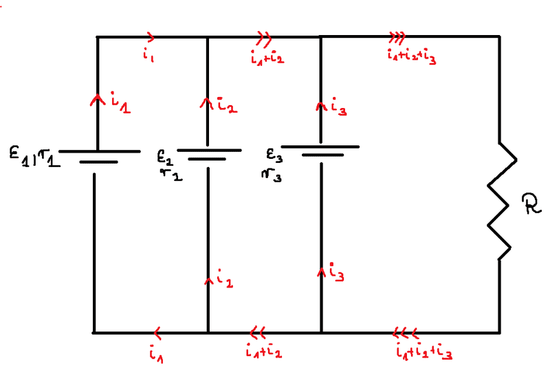 The discussion focuses on solving a circuit with multiple voltage sources, specifically addressing the marking of currents and the formulation of a system of equations. The equations presented are: ε1 = i1 r1 + (i1 + i2 + i3) R, ε2 = i2 r2 + (i1 + i2 + i3) R, and ε3 = i3 r3 + (i1 + i2 + i3) R. The solution provided is confirmed as valid by participants in the discussion.