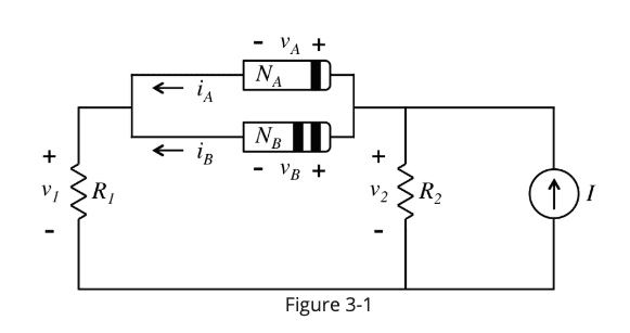- Two non-linear devices are placed in parallel in the circuit show in Figure 3-1. The resistors in the circuit have the following values: ##R_1 = 2## Ohms and ##R_2 = 1## Ohms.