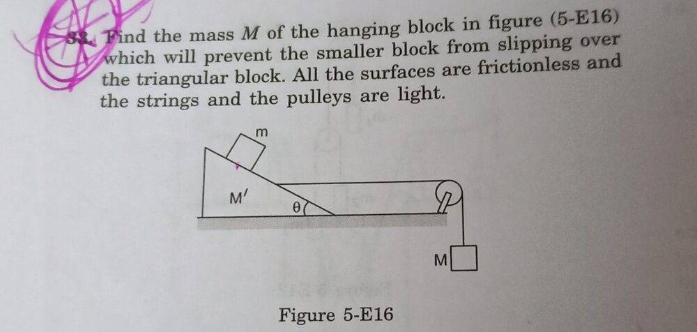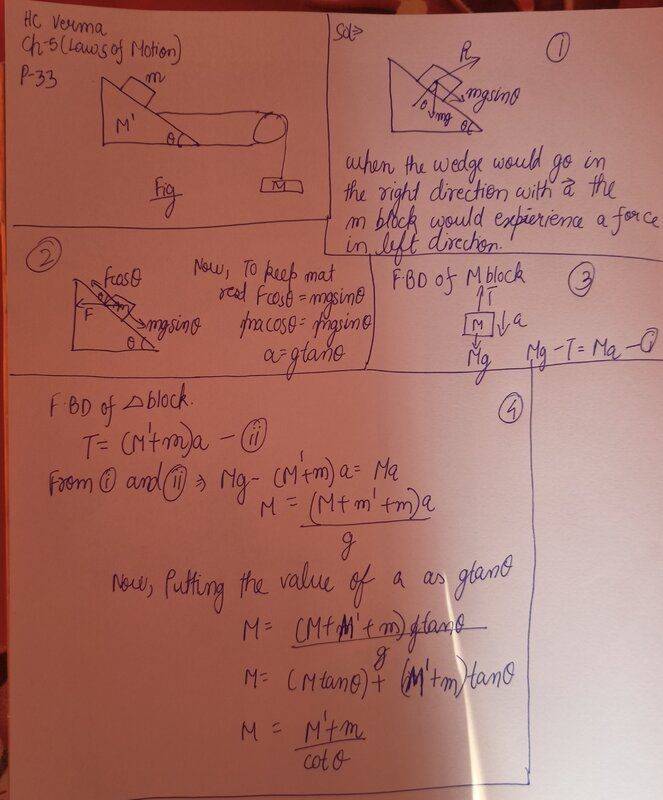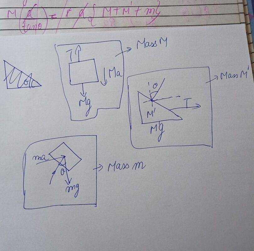 The discussion revolves around a classic string and pulley problem involving free body diagrams, forces, and acceleration of masses in a system with a wedge and a block. Participants are attempting to analyze the forces acting on the components of the system and how they relate to each other according to Newton's laws.
