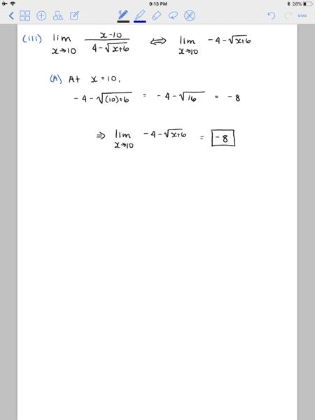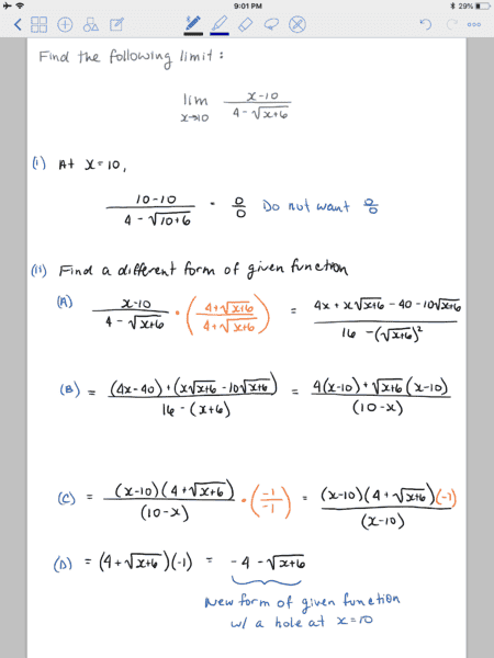 From the definition of limit, it follows that whenever two function are equal for all x≠a, then those two functions must have the same limit as x-->a. Hence to evaluate a limit of a given function as x-->a, we try to find another function that equals it at least for x≠a, and such that the other function is easier to find the limit for. Such easy functions are those whose limits equal their values, and are called “continuous” functions. In particular, all polynomials and all root functions are continuous where defined. Moreover a quotient of two continuous functions is continuous where the bottom is not zero. Thus the basic trick for finding the limit of f as x-->a, is to find a continuous function g that equals f when x≠a. Then the limit equals g(a).Note also that understanding limits is the same as understanding continuous functions, since f is continuous at a if and only if f is defined at a and the value f(a) equals the limit of f(x) as x-->a. Moreover, assume the limit of f(x) exists as x-->a, and equals L. Then even if f is not originally defined at a, if we extend the domain of f by defining f(a) to equal this limit L, the new extended f becomes continuous at a. This has been mentioned several times above as well.