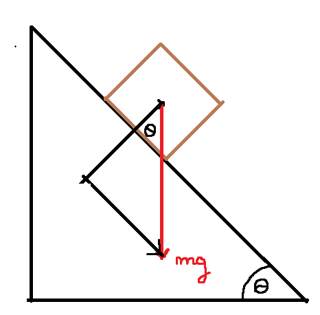 The angle between the vertical component of the force of gravity and the force itself is 45 degrees, because the line containing the force vector also contains the diagonal of the square. The vertical component is parallel to the side of the cube, therefore, the angle must be 45 degrees.
