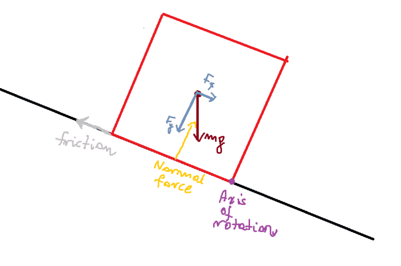 I think that the cube will tip over once the force of gravity has gone outside its base - the critical angle is plotted on my diagram.