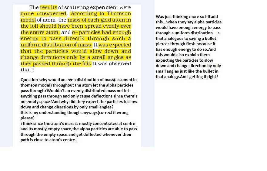 - Another participant argues that the expectation of force during scattering is related to the location of charge rather than mass, explaining the differences between the plum pudding model and the nuclear model in terms of electric repulsion experienced by alpha particles.