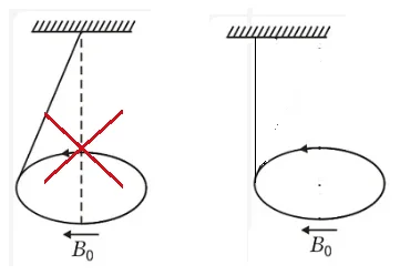 - A uniform current carrying ring of mass m and radius R is connected by a massless string as shown in diagram. A uniform magnetic field Bo exists in the region to keep the ring in horizontal position, then the current in the ring is ( l length of string)
