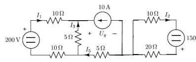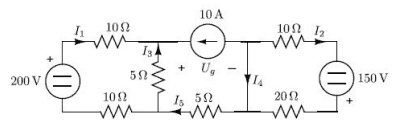 The problem involves analyzing a circuit using Kirchhoff's laws to find the currents I1, I2, I3, I4, I5, and the voltage Ug. The original poster presents a series of equations derived from the circuit analysis but encounters difficulties with certain knot equations.