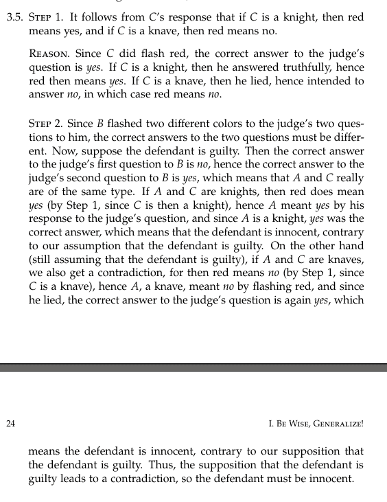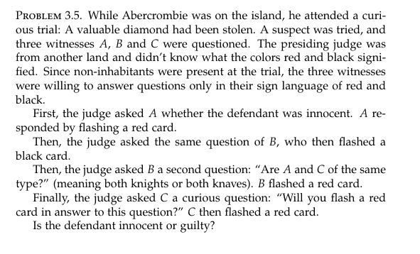 I’m going through this book and it contains many puzzles and solutions. I’ve encountered a problem that makes no sense to me. I’d spent a considerable amount of time on it before I finally gave up and looked at the solution, where I discovered essentially the deductions identical to mine.